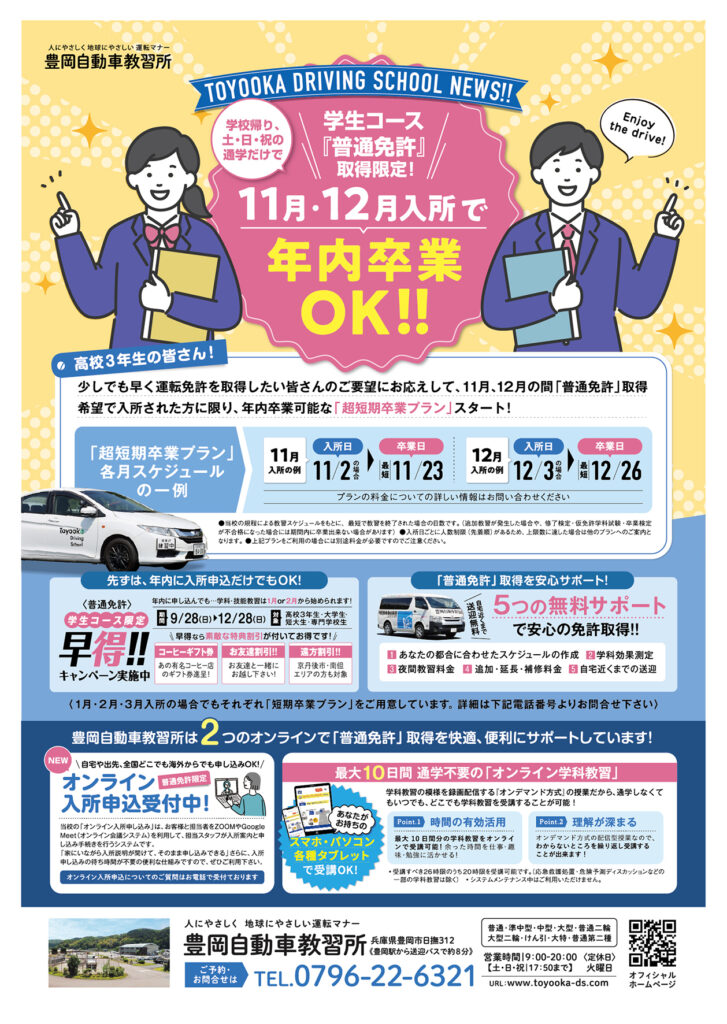 高校3年生の皆さんの少しでも早く運転免許を取得したいというご要望にお応えして、年内に入所すれば年内に卒業できる「超短期卒業プラン」スタート!学校終わりと土日祝を利用すれば年内卒業できます。
